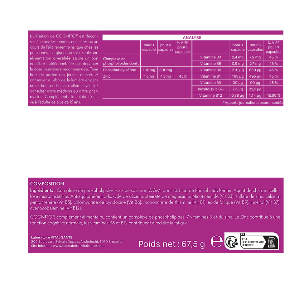 L’utilisation de Cognito est déconseillée chez les femmes enceintes ou au cours de l’allaitement ainsi que chez les personnes allergiques au soja. Seule une alimentation diversifiée assure un bon équilibre nutritionnel. Ne pas dépasser la dose journalière recommandée.